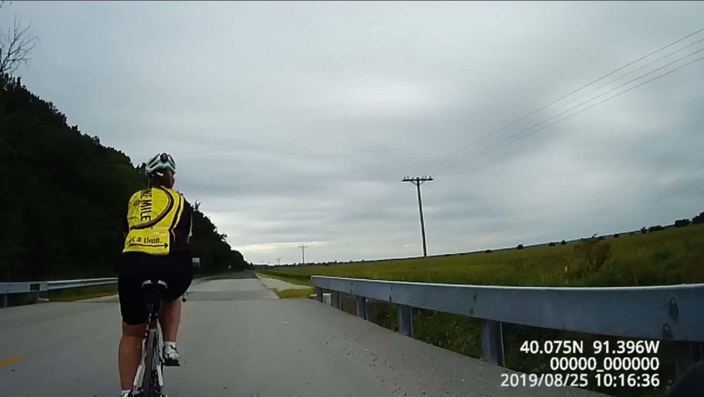 Tom came up on Dale and Scott along the way, then rode alongside Laura just prior to the bike to bike transfer. I took over and then Laura and I rode together, having a nice conversation about family and home and Laura’s journey from Keokuk to Quincy, amongst other things.