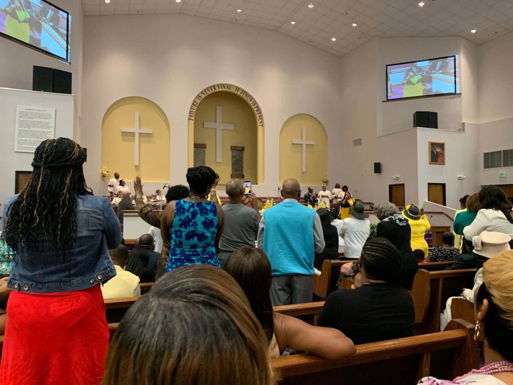 As we walked in the door, everyone greeted us with “welcome to Old Saint Paul”—its was clear we were newcomers. Some kind folks directed us through the sanctuary door, and we found a seat in the middle. The service began with some messages of welcome and thanks from a woman at a lectern in front, and the congregation was still trickling in. But soon enough, the “master of ceremony” Latoya J, an emerging Gospel singer, was introduced and everyone in the congregation was roused to their feet. The band started erupting in music and the cry of “Hallelujah” turned to song in grand call and response style, with clapping hands, hands raised, swaying bodies—the spirit emboldening the choir and the congregation beyond.