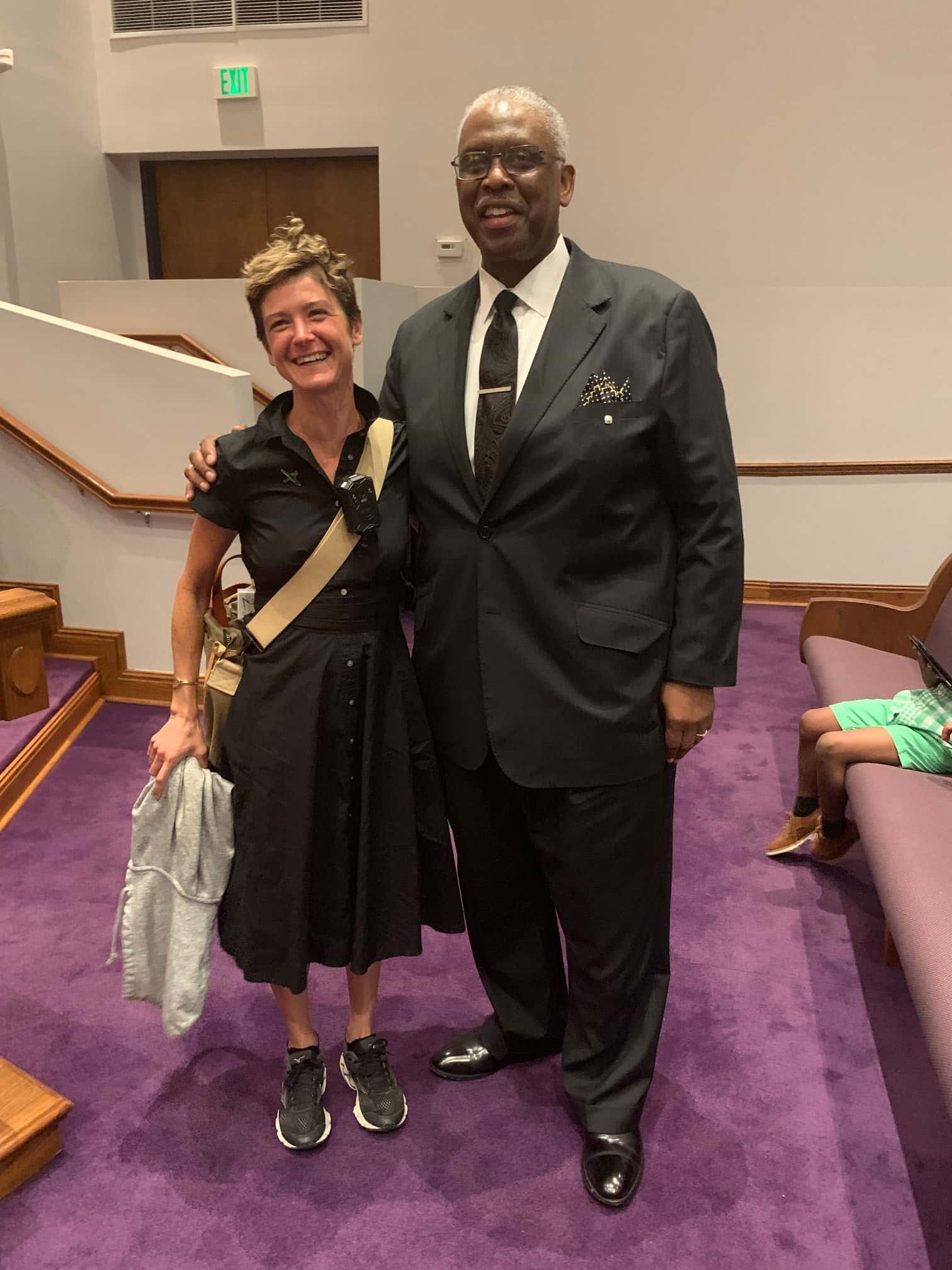 Anyhow, time to head to church! West Memphis, Arkansas has its own identity and we’re spending two days here to discover it all. As we turned down 8th street to find the church where we’d meet our host Fred Leonard, we saw several churches—not that church, not that church, nope not that church—there it is, the oldest congregation we’ve been told, Old Saint Paul Missionary Baptist Church. The parking lot and street side were already full of cars and congregants, so we pulled down the block to make a quick change out of our sweaty running gear, buying as much privacy as possible. Our version of “Sunday best” paled in comparison to the fancy hats, suit jackets, and polished shoes that were making their way into the sanctuary, but we tried.