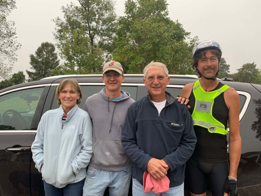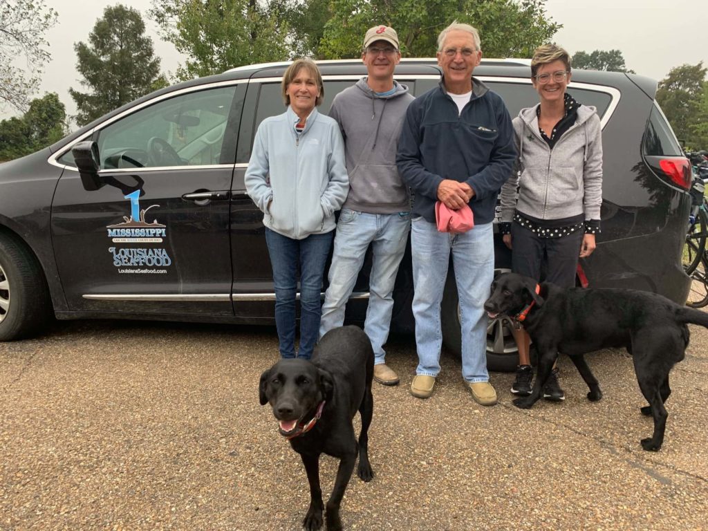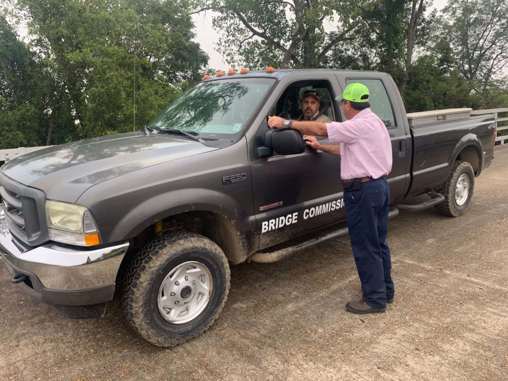 Our new favorite animals, black labs Miller and Storm, as well as Bob the orange tabby cat gave us a nice farewell… and oh yeah, the Yerger family were there too! We all got together for a picture, Ed through in some sausages for our cooler, and Tom headed out on bike toward the foot of the Vicksburg Bridge, Old Vicksburg Bridge. I arrived before him in the van and while waiting for Herman Smith from the bridge commission in Vicksburg to meet me, another truck drove up from the Louisiana side. Apparently in my haze, I had left behind my good running shoes, and Ed kindly brought them out to me. Herman walked from the edge of the bridge to meet us and we had our introductions, explaining a bit about the project and that Tom instead of me would be joining him to cross the bridge today.