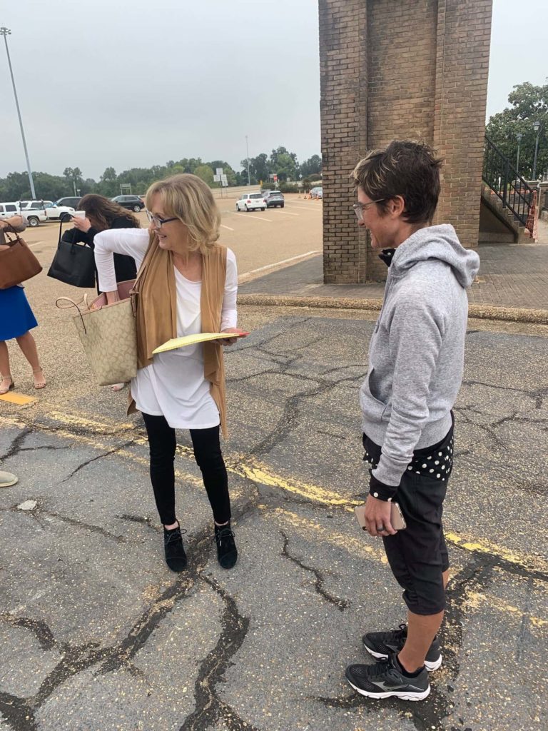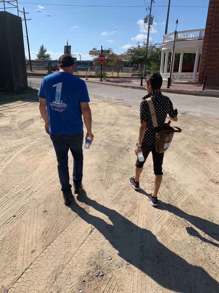 I had driven to the Mississippi side over the interstate bridge, pulling in at the welcome center, waiting for two figures to appear in the distance beyond the gates. Once they arrived, I heard some applause from behind me—turns out we had a welcoming party assembled, including Terri from the newspaper, Laura Beth and Ashley from Visit Vicksburg, Linda who we’d be spending time with later in the day, and several others… We did a quick interview with Terri Frazier for the Vicksburg post, but then I had to hurry up into town to do another interview—this time for radio—with Emily Tillman of V105.5 Vicksburg. While Emily and I talked into the microphones, recording a segment to later air on 490AM/107.7FM/newstalk1490.net, Tom had to cover the distance. He was running uphill into downtown Vicksburg, looking for the yellow house on the left. Just as we closed out, he found us! Perfect timing.