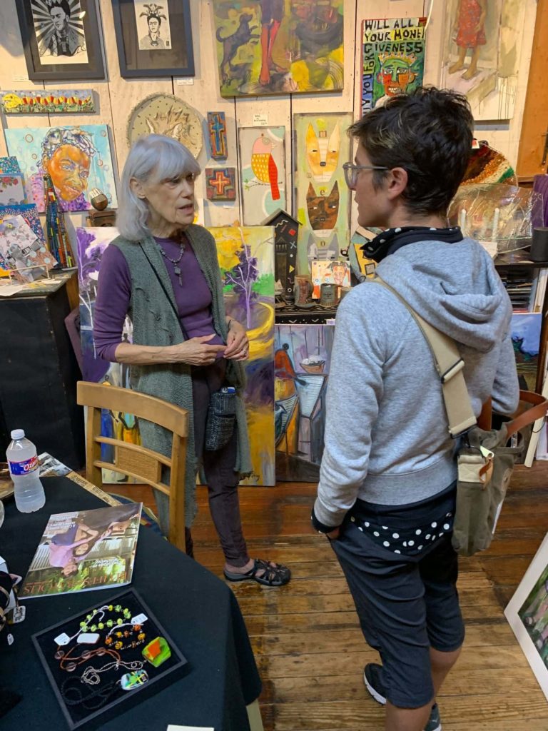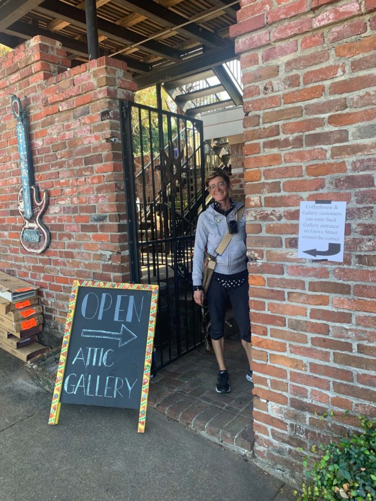 We left the gym to head back downtown for a 1pm meeting with the mayor. It seems the appointment was never written in his book, though, so we missed him this time through! Maybe next time… This gave us a bit of time for a brief driving tour of downtown, spotting our next stop—The Attic Gallery above Highway 61 Coffeehouse on Washington Street. A group of men were engaged in heavy construction to the front of the building and directed us around to a back entrance up the hill. We grabbed a couple coffees downstairs, meeting a couple guys playing chess rather seriously, then we headed upstairs to meet Lesley Silver, owner of the gallery.