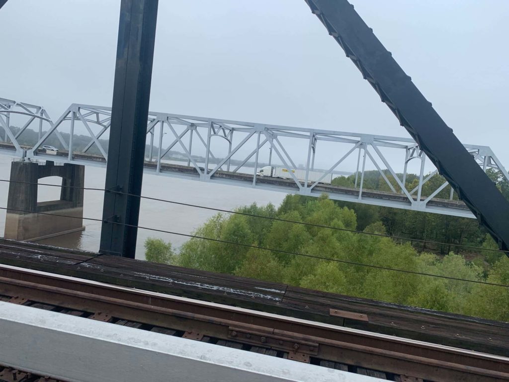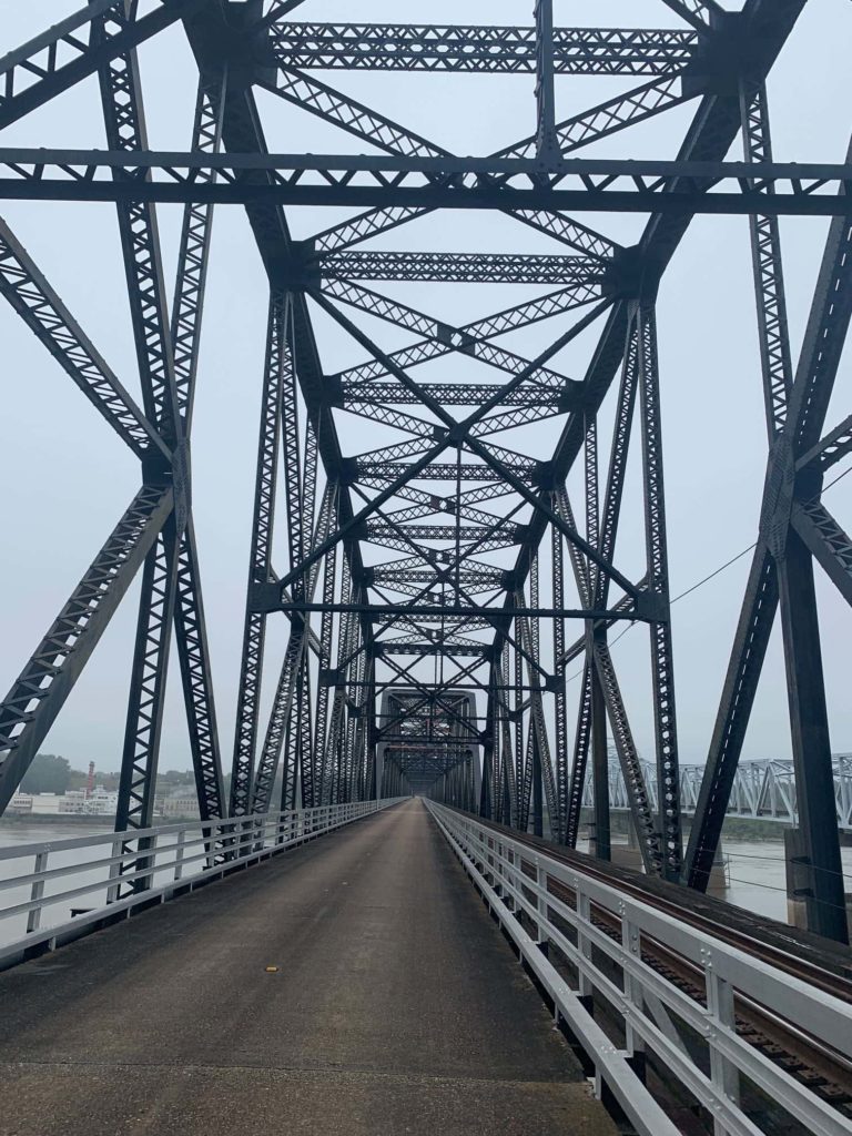 Ed took off back to Mound, and not moments later Tom rode up, toweled off, and began the “tour” across the Old Vicksburg Bridge. They only open this bridge for pedestrian traffic on special occasions and organized events, or if you fill out a long form so I hear… But in order for us to fulfill our mission of traversing every mile, foot, and inch at the human scale, Herman offered to “tour” Tom across, at walking speed. When you get a bridge engineer together with the Superintendent of the Bridge Commission, such a tour can take a lot longer than the walking route estimated by Google Maps.